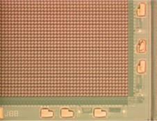 | It consists of a two-layer structure. An interconnecting readout circuitry is applied to the silicon process wafer and then the microbolometer structure is built on top of the readout circuitry. First a pattern of islands _ wavelength thick are deposited on the readout circuitry. The islands are made of a material that can be selectively etched away later to form a bridge structure. Three layers -- silicon nitride, vanadium oxide, and silicon nitride -- are deposited over the sacrificial islands. The sacrificial islands are then etched away leaving the thermally isolated bridge structure of vanadium oxide. A photo of an early Honeywell microbolometer element is shown in the picture below followed by a photo of one corner of a 320 by 240 microbolometer array |