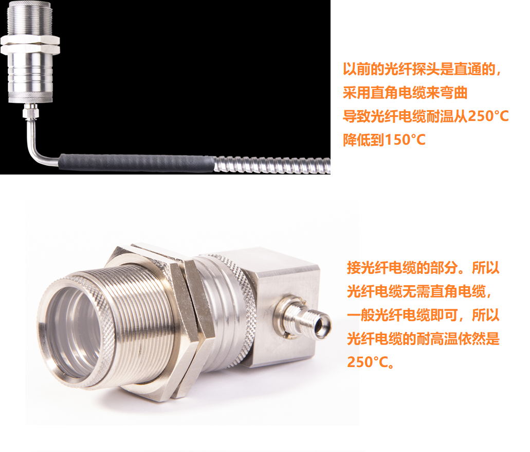 這樣我們就很容易理解直角光纖探頭的優點了,就是不再使用彎角光纖電纜,保證了光纖電纜耐溫250°C不變。